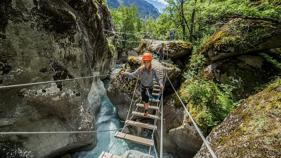 И вот заключительно испытание - сложная феррата, проходящая в узком каньоне с бирюзовой водой!